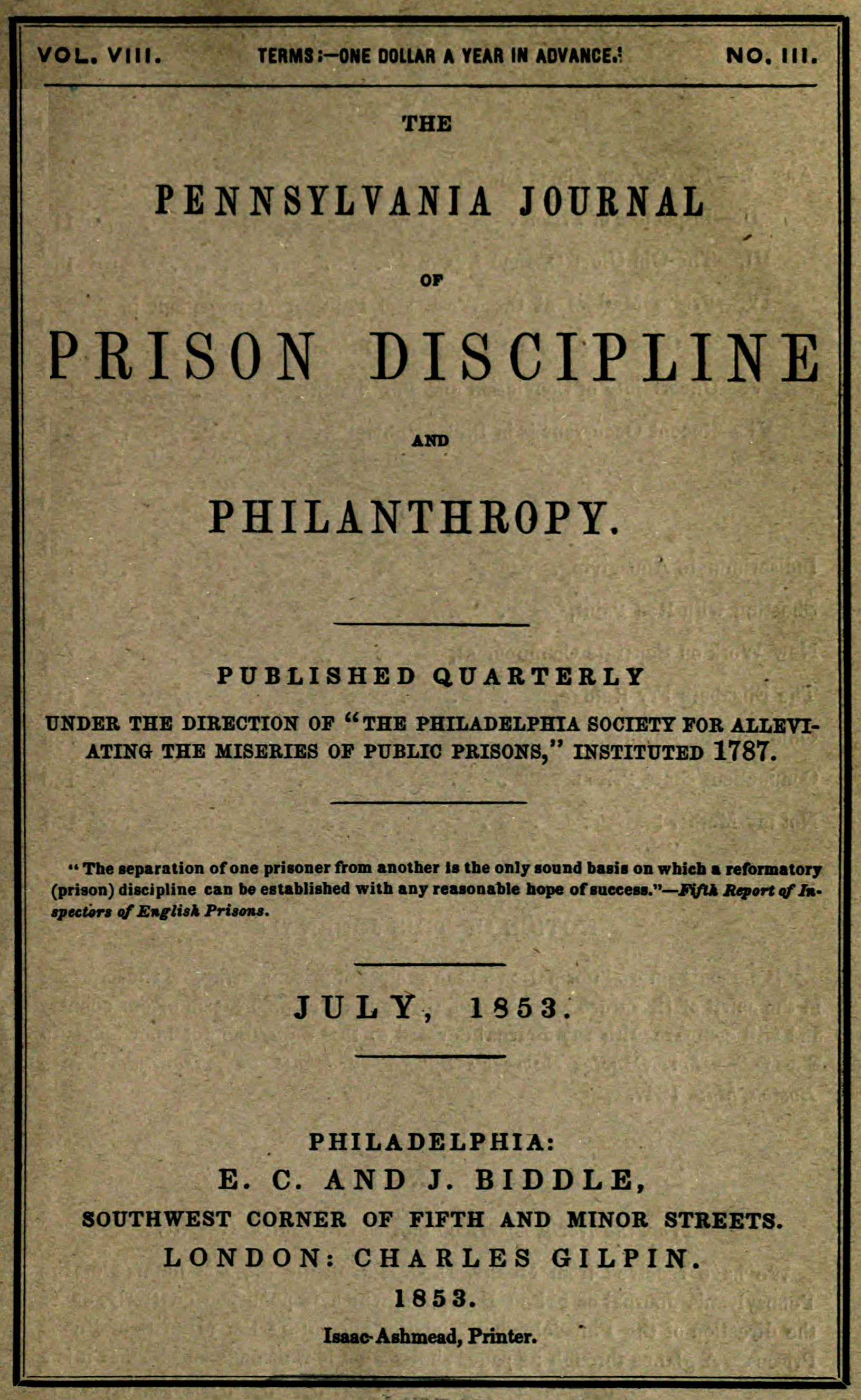 Title: The Pennsylvania Journal of prison discipline and philanthropy (Vol. VIII, No. III, July 1853)