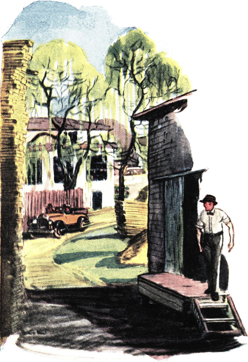 A half hour later they swung down a long hill and into the main street of a little town, nestling in a deep valley, with a long, lake-like arm of the Sound coming nearly to the center of the village. They turned off and wound through a big yard where piles of boards and planks and beams rose up 13like top-heavy buildings along the narrow roads. The smell of cedar and pine hung in the air. They drew up at the wide-open door of a shed from which came the whine of buzz-saws and the pounding of hammers. They had hardly stopped when a sunburned man appeared at the door, evidently expecting them.