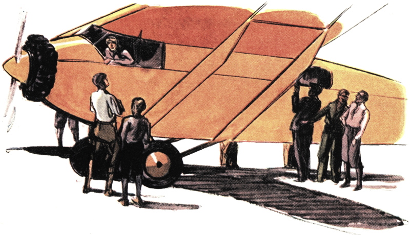 Its single huge wing glistened in the sunlight. The pilot and navigator’s cockpit, covered with glass, was just in front of this wing and behind the huge radial engine which was even then slowly and smoothly turning the propeller. Just behind the wing in the body of the machine was a tiny window, through which those who were tall enough could peek in and see a small compartment behind the gas tank. 17The two wheels of the undercarriage[3] bore massive balloon tires and were further protected by large shock absorbers upon which the weight of the plane rested. The whole plane was painted a brilliant orange.