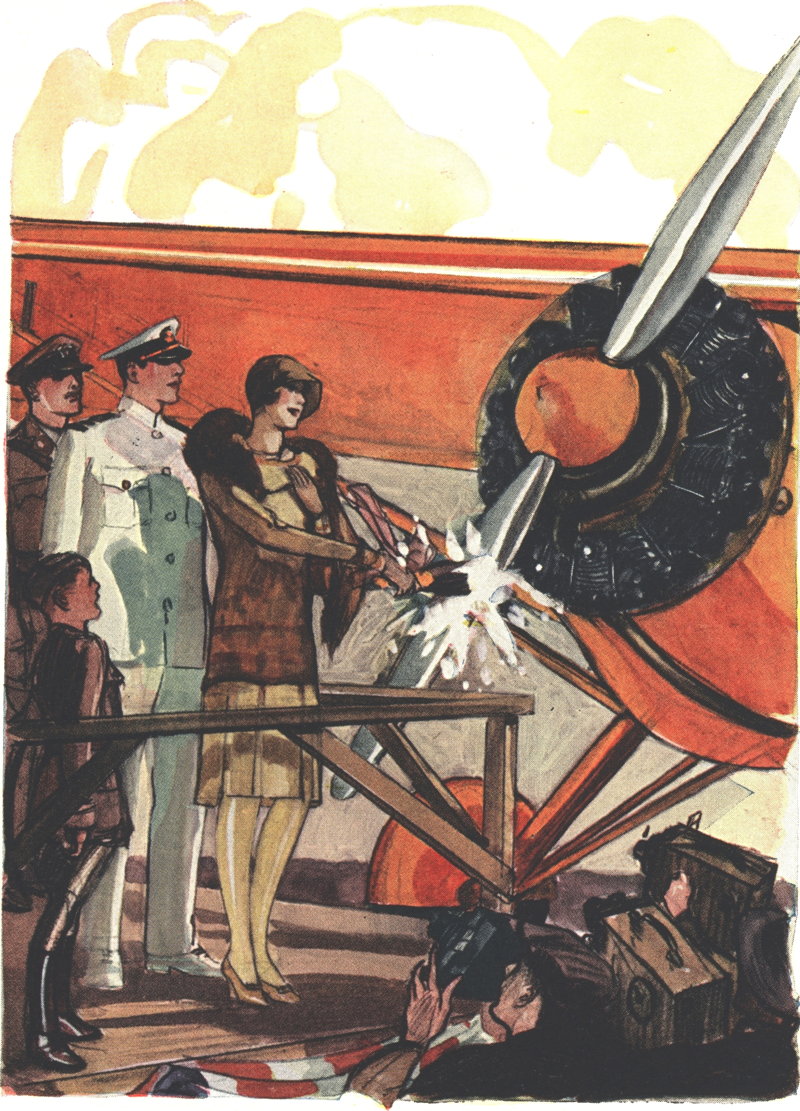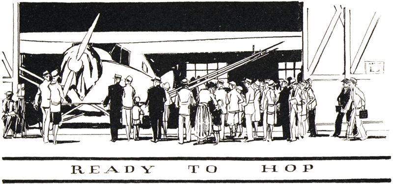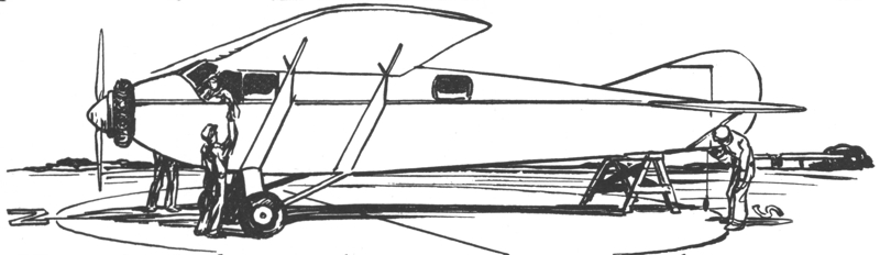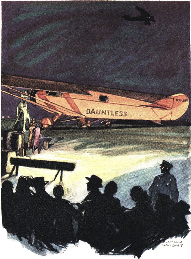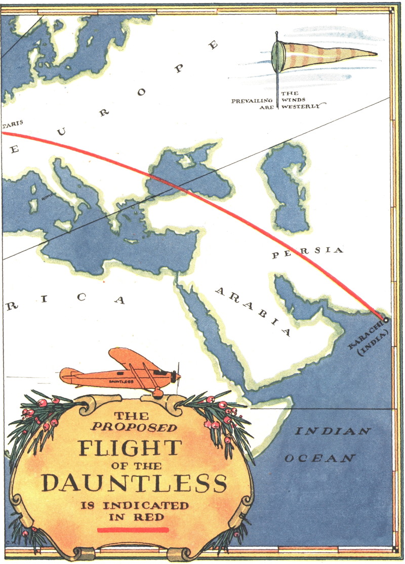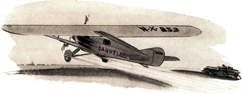 At last, late in the afternoon, the sound of a different motor drew the attention of the pilots and mechanics to a new plane coming in from the west. It circled the field several times, and came down to land at the far end. Wheels and tail skid gently touched, and the plane rolled along with scarcely a bump. It taxied up to the hangars and was soon surrounded by an excited group curious to see all the new features of this bird which was to attempt such a tremendous hop. For the word had traveled that here was a new challenger for the long distance record. Here was a machine, equipped with all the latest gadgets,[2] in which two experienced flyers were planning to leave New York and not touch their wheels again till they arrived in far off India.