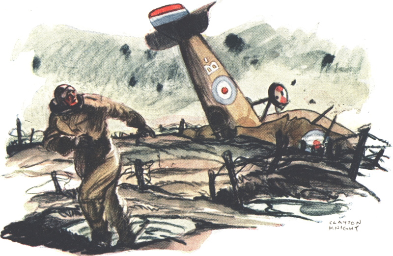 “It crossed my mind as we were getting low over the trees that I should have opened up the engine for a few seconds to keep it warm. A long dive such as we had just made was apt to cool it to the point where it might not pick up again 145when I needed it. But there was no time for that now. We were too low and the noise of it might arouse troops that happened to be in the vicinity. Sideslipping into the field, I straightened out just in time, and we came to a stop beside a fringe of trees.