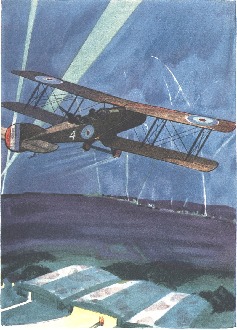 “The motor hummed sweetly and I began looking for landmarks. There was no moon and the earth was a black smudge beneath me. I crossed the lines at a great height and could just discern the Lys River as a dim streak in the inky blackness. There were a few star-shells coming up from the direction of the lines, and here and there an occasional flash of artillery fire. It was a quiet night in this particular sector. A few miles to one side two searchlights were groping aimlessly across the sky. All seemed serene and peaceful up aloft.