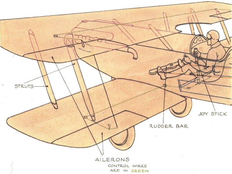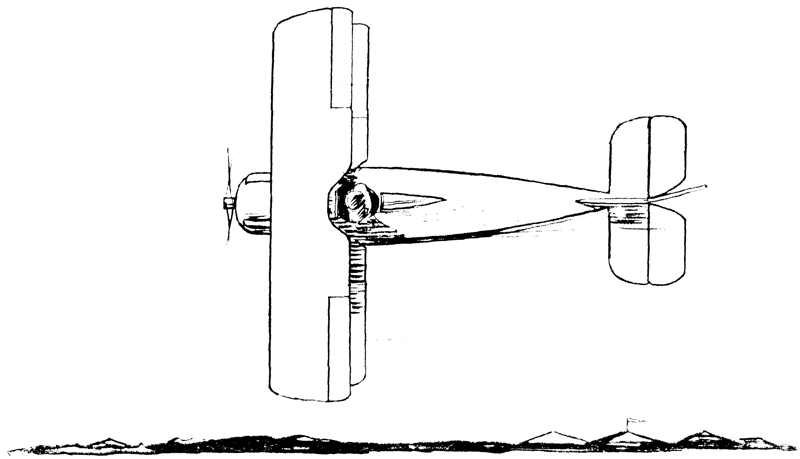 Time after time Kiwi got into spins whenever Armbruster’s instructions as to the turns were not properly followed. But it was not long until he had become accustomed to the actions of the plane in a tail-spin, and as they were still very high he was able to pull them out.