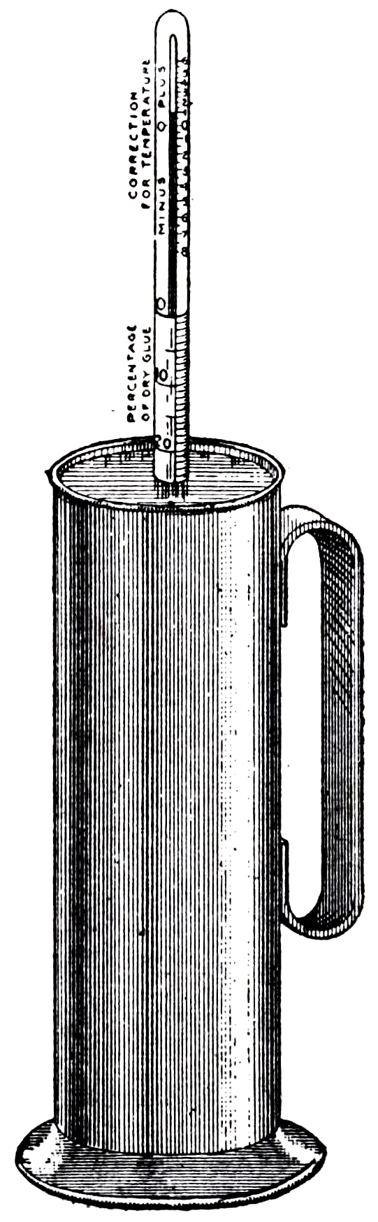 | Grades established by Peter Cooper — the tests — viscosity or fluidity test — the jelly test — apparatus for making jelly test — the finger test — a simple, practical test for glue users — sampling — bubbles — surface indications — color indications — alkaline or acid quality — breaking quality — foam — grease — keeping properties — odor — laboratory test | Page 25 |