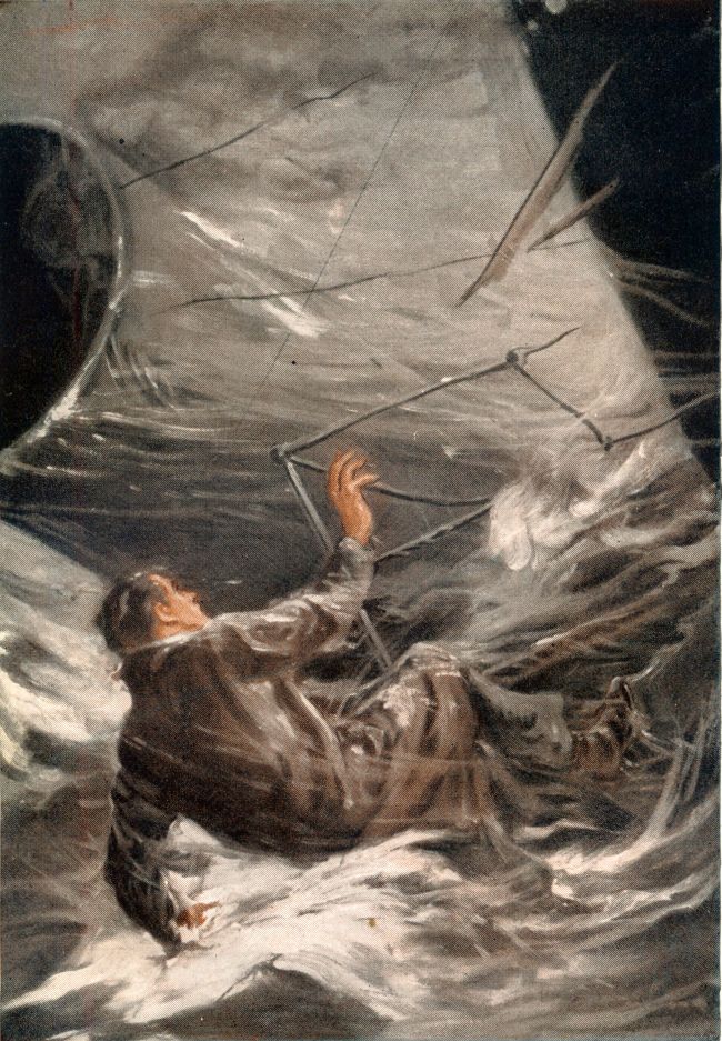 Over went the boats while the cruiser, with propellers idle, sidled closer through the leaping waves. The submarine’s bow rose higher and higher and it was evident that she would soon go down stern-first. Some of those on the deck, jostled by their companions, slid off into the water. Others deliberately plunged in and began to swim toward the battleship. From Number Four gun port they saw the boats halving the distance.
