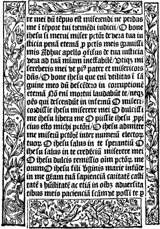 The first printers naturally turned to these manuscripts, not only for the models of their types, but for other hints—and what did they find? They found that the scribes generally began on the second leaf of the vellum or paper, and that sometimes the vellum or paper was ruled with faint red lines for margins and for evenness of line. They found that the title of the work was put at the head of the text, and that the first page of the text was enclosed within a richly illuminated border, sometimes merely decorative or conventional, but more often consisting of exquisitely drawn and coloured pictures,[4] illustrating, if it were a service book, scenes in the life of Our Lord or fragments of sacred history.