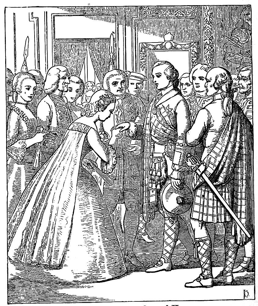 There he had his father proclaimed King of England, Scotland, and Ireland, and gave titles of dukes and lords to the gentlemen who came to fight for him, and pretended to be the real Prince of Wales. And he lived in the old palace of the Scotch kings, called Holyrood House, and there he gave balls and concerts to the Scotch ladies, and they all fancied themselves sure that Charles Edward would be their king instead of George.