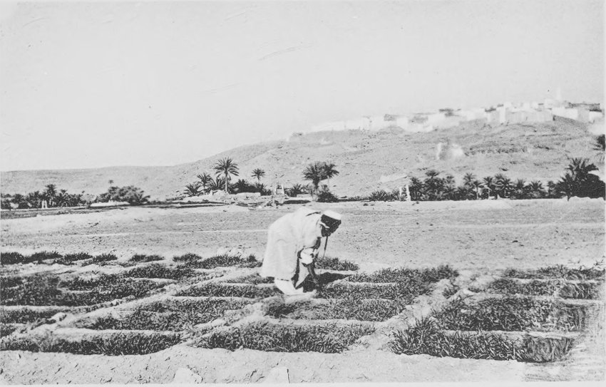 | 19. | Agriculture at Ghardaia. The fields are divided into plots about 3 by 4 feet in size, for the more economical use of water. Young barley is shown growing (November). | |||