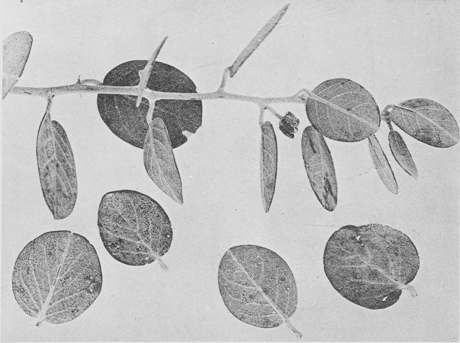 [31]Briefly the case is as follows (see The root systems of desert plants, loc. cit.): Opuntia arbuscula growing near Tucson develops fleshy roots, but what is probably the same species growing about 100 miles distant has fibrous roots. Also, seedling opuntias have fleshy roots. Opuntia vivipara, which occurs naturally in the bottom of an arroyo (oued), may or may not have fleshy roots. By preliminary series of experiments it was learned that all opuntias tested which had an abundant water-supply developed fleshy roots, and it is assumed from this that the differences in this character as observed in nature had also such a physiological basis.