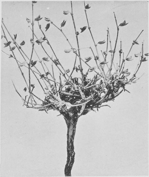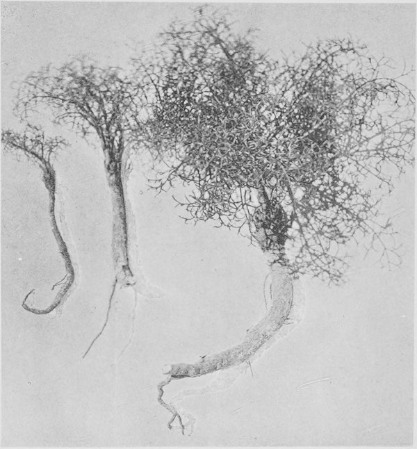 [8]The Root Habits of Desert Plants. W. A. Cannon. Carnegie Institution of Washington Publication No. 131. 1911. This paper gives a descriptive classification of the main root-types in the deserts of the southwest, in which such a root as found in Acanthyllis is called generalized, in distinction to roots like those of most of the cacti, or Zizyphus, the former having a system wholly superficial and the latter a system wholly deeply placed, as specialized. The specialized root-systems appear to be so fixed in character as to be not easily changed, while the generalized type is flexible. It will be self-evident that the type of root-systems may be of great importance in determining the local distribution of a species.