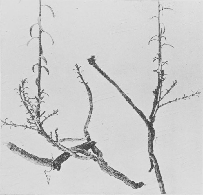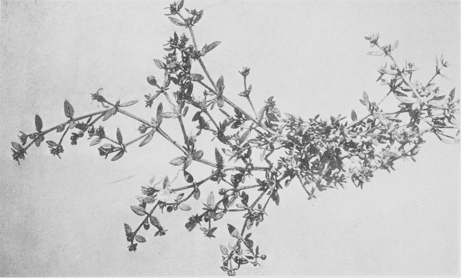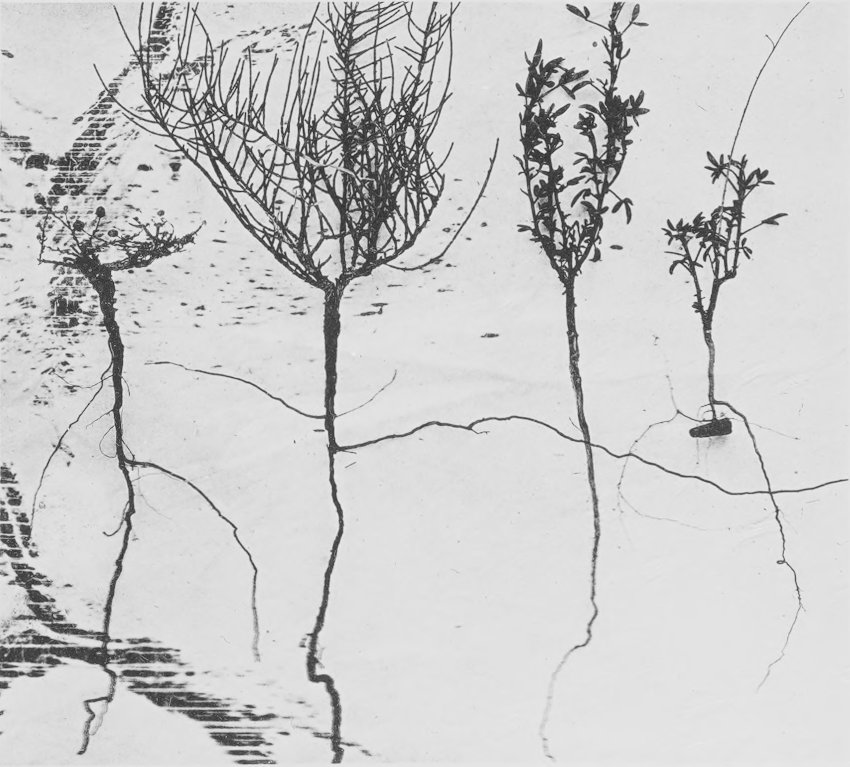 [28]In the case of annuals the differences in development of the shoot between plants well watered and those with only a meager supply are very striking. In one instance in the Tucson region specimens of Parietaria debilis growing in extreme conditions, one moist and the other arid, varied in length between 39 cm. and 8 mm., or a difference with a ratio of 49 to 1. (Root Habits of Desert Plants, loc. cit.)