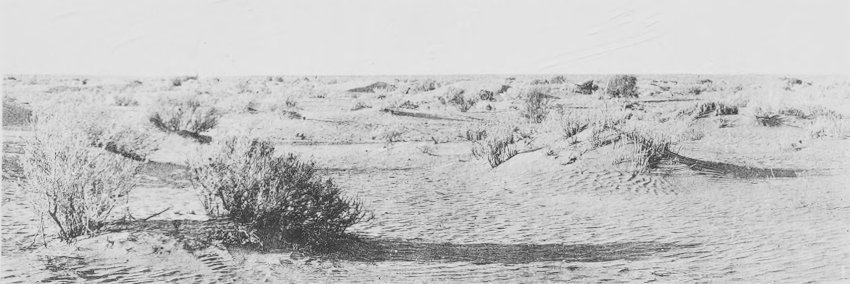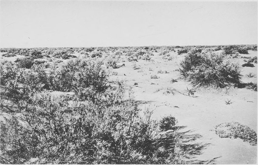 Fig. 58. Vegetation of the reg. desert, about 25km. north of Ouargla. Ephedra and Retama are the leading species of the area a spreading dune.