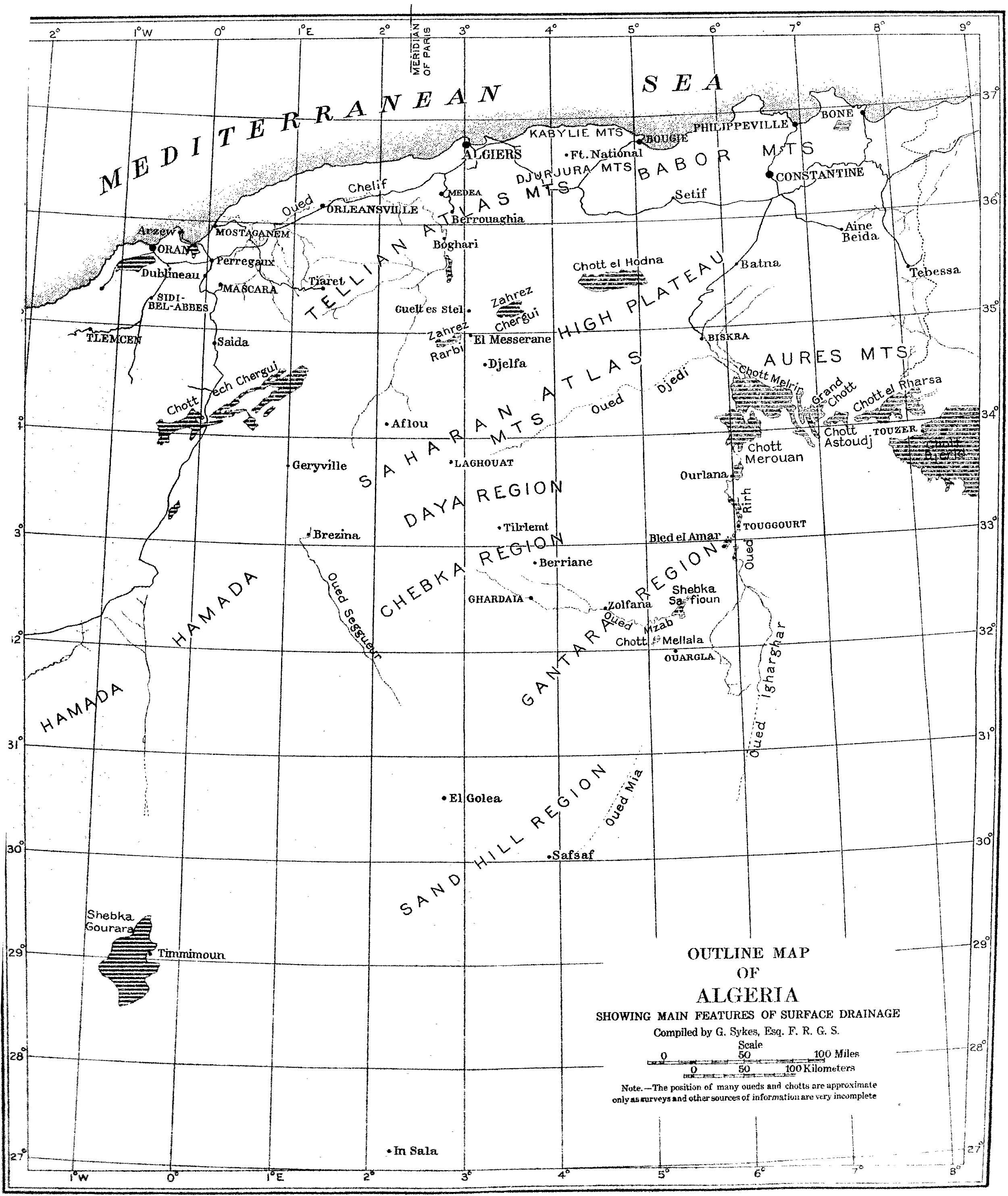 | Plate A. Outline map of Algeria, showing main features of surface drainage. | ||||