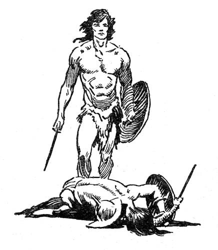 Tarzan swung his bow and his quiver of arrows across his back. Over his left shoulder and under his right arm lay the coils of his grass rope and at his hip dangled the hunting-knife of his long-dead sire. He picked up his short spear and stood for the moment with head up, sniffing the breeze. The firelight played upon his bronzed skin.