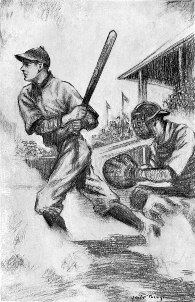 He made good a second time, lacing a single into short right field, and Oleson and Miller rounded third and started for home hardly twenty feet apart. Oleson made it standing up but little Tad was crouched over the rubber waiting for the ball as Miller came thundering down from third, and Wade Grenville with a fine throw shot it down into Tad’s mitt just as the runner slid feet first for the plate. Tad and Miller were all tangled up when the dust cleared away. The umpire signaled that Miller was out, and the little Pennington captain got to his feet with a look of pain on his face. His stocking was ripped down the shin and blood was oozing from a nasty spike wound that he had received in the mêlée.