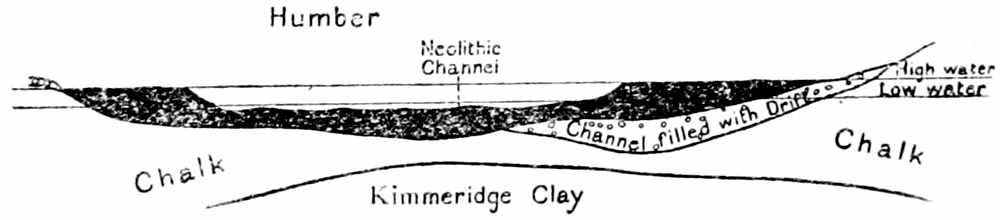 The next question we have put—What light do these submerged forests throw on the antiquity of man in Britain, or on the race-problems of Britain?—is a difficult one to answer in the present state of our knowledge. Valuable evidence has been lost through the failure to preserve most of the human remains that have been found; but both Owen and Huxley recognised the peculiar type of the “river-drift man.” Unfortunately few implements have been collected, and the pieces of wood shaped by man, though recorded, have not been preserved. One implement of polished stone has certainly been found in the latest submerged land-surface, but it is not clear that anything except flakes has been obtained in the older deposits. Still the stratigraphical relations seem to indicate that all these deposits are of Neolithic age and later than the Palaeolithic terraces. The relations of Palaeolithic to Neolithic are still very obscure in this country, and the reason is perhaps to be sought in a submergence which has tended to carry many of the transition deposits beneath the sea-level, or has caused them to be silted up under more modern alluvium. The lowest submerged forest requires careful search before we can be certain of its true position in the sequence; but it is seldom exposed, and then only in dock-excavations soon again hidden.
