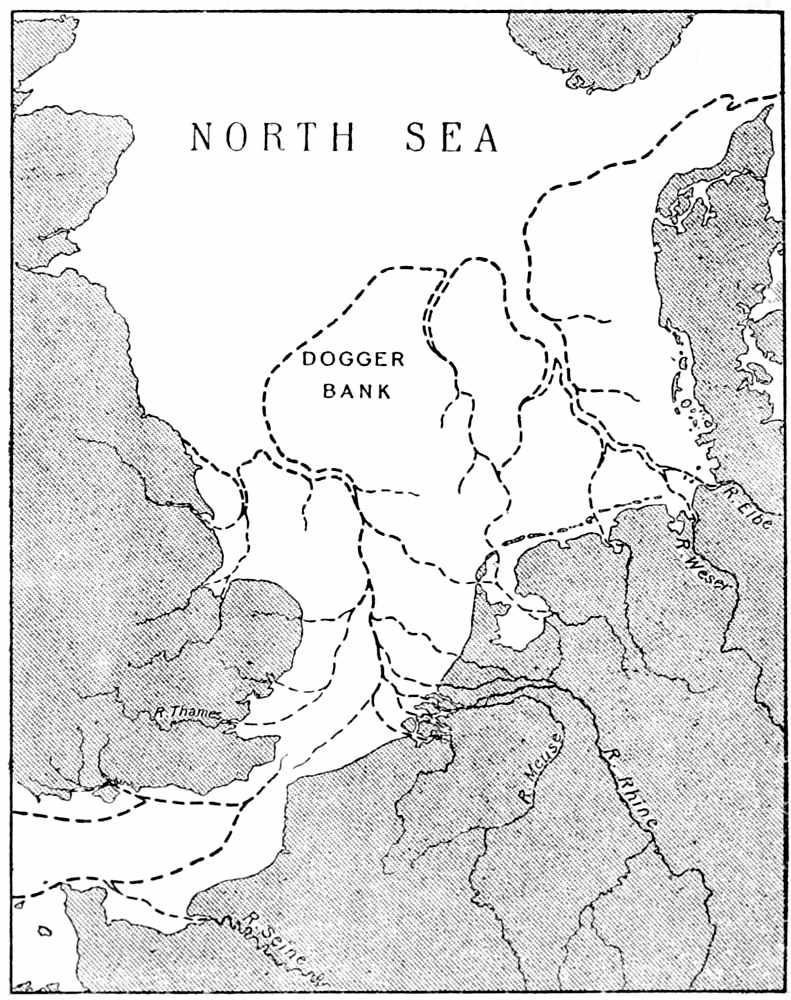 In this connexion it might be worth while systematically to dredge the Dogger Bank, in order to see whether any implements made by man can be found there. The alluvial deposits are there so free from stones that if any at all are found in them they may probably show human workmanship. The Dogger Bank may have remained an island long after great part of the bed of the North Sea had been submerged, for the Bank now forms a submerged plateau. It may even have lasted into fairly recent times, the final destruction of the island being due to the planing away of the upper part of the soft alluvial strata through the attacks of the sea and of boring molluscs. Pholas is now actively attacking the hard peat-beds at a depth of more than 10 fathoms, and is rapidly destroying this accumulation of moorlog, wherever the tidal scour is sufficient to lay it bare.