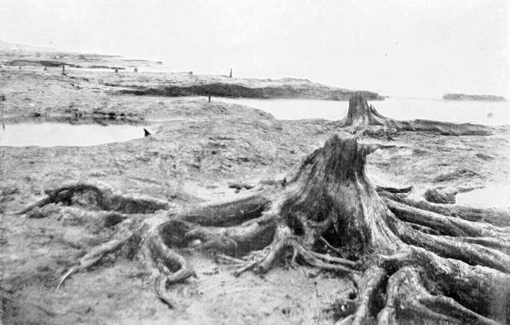 The first point to be considered is the length of time occupied by the growth of the series of submerged forests. On first examining, or reading accounts of, deposits of this sort one obtains a vague impression of long periods, during which mighty oaks flourished. Both the movements of submergence and the intervening periods of vegetable growth seem to require great lapses of time. On closer study, however, the evidence seems scarcely to support this view, for estuarine silts are deposits of exceptionally rapid growth, and one finds that the usual characteristic of a “submerged forest” is that it shows indications of only a single generation of trees. The trees also are usually small, except where the submerged forest rests directly on deposits of much earlier date, or on solid rock.