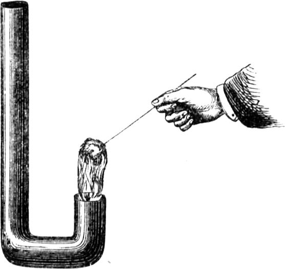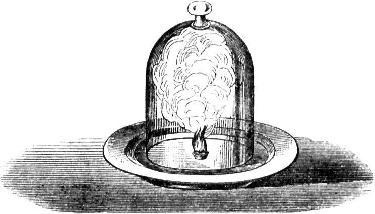 Wir gelangen nunmehr zu einem anderen und zwar sehr wichtigen Teil unseres Thema. Erinnern wir uns, was wir bereits an unserer brennenden Kerze erforscht haben. Wir sahen, daß sie beim Brennen verschiedene Stoffe entstehen läßt, und fanden Kohle in Gestalt von Ruß[19], Wasser und etwas anderes, was wir noch nicht untersucht haben. Das Wasser fingen wir auf, die übrigen Verbrennungsprodukte ließen wir bisher ungehindert in die Luft entweichen. Diese nun müssen wir jetzt unserer Forschung unterwerfen.