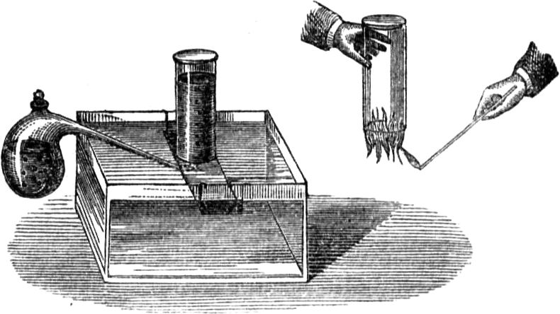 Wir haben gesehen: beim Verbrennen einer Kerze gewinnen wir Wasser, und aus diesem Wasser können wir Wasserstoff und Sauerstoff darstellen. Der Wasserstoff, wißt Ihr, stammt von der Kerze her, und der Sauerstoff tritt aus der Luft hinzu. Da könnt Ihr nun mit Recht fragen: »Wie kommt’s denn aber, daß die Kerze nicht gleich gut in Luft und in Sauerstoff brennt?« Ihr erinnert Euch recht gut, wie ich ein brennendes Stückchen Kerze in Sauerstoff brachte (vergl. Fig. 22, S. 126), daß da die Verbrennung eine ganz andere, nämlich viel lebhafter war, als in der atmosphärischen Luft. Nun, warum das? Diese Frage ist von der höchsten Wichtigkeit für uns, sie berührt ganz unmittelbar die Natur der atmosphärischen Luft, und ich werde mich bemühen, sie Euch verständlich zu beantworten.