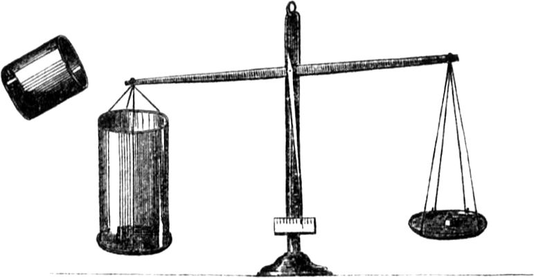 Noch augenfälliger zeigt sich die Schwere der Kohlensäure an folgendem Experiment auf meiner Wage. Auf die eine Wageschale habe ich ein Glas gestellt und durch Gewichte auf der andern Seite die Wage wieder ins Gleichgewicht gebracht. Ich gieße nun dieses mit Kohlensäure gefüllte Glas in das Gefäß auf der Wage aus, das erst nur atmosphärische Luft enthielt, und Ihr seht, wie es sofort niedersinkt. Auch jetzt will ich die Untersuchung mit meinem brennenden Wachsstock nicht unterlassen – wir sehen, wie ihm das Fortbrennen[162] in dem Gefäß auf der Wage unmöglich wird, wissen also, daß sich wirklich Kohlensäure darin befindet.
