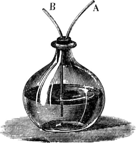 Um über diesen wichtigen Gegenstand noch klarer zu werden, wollen wir doch einmal sehen, was mit dem Kalkwasser geschieht, wenn es mit der Ausatmungsluft in Berührung kommt. Hier ist ein Glaskolben, der etwas Kalkwasser enthält; durch die Glasröhren im Stöpsel kann Luft hinein- und heraustreten, so daß wir die Einwirkung der geatmeten, wie der frischen Luft bequem beobachten können. Ich kann nun entweder durch A Luft einsaugen und so in meine Lungen gelangen lassen, nachdem sie durch das Kalkwasser gegangen ist; oder ich kann die Luft aus meinen Lungen durch die bis auf den Boden gehende Röhre B treiben und ihre Wirkung auf das Kalkwasser zeigen. Gebt Acht – ich werde bei A beginnen –; jetzt habe ich also längere Zeit die äußere Luft in das Kalkwasser gezogen und dann durch dasselbe hindurch in meine Lungen; es zeigt sich aber nicht die geringste Veränderung, das Kalkwasser ist durchaus nicht trübe geworden. Nun will ich’s aber umgekehrt machen, also[182] die Luft aus meinen Lungen durch das Kalkwasser hindurchtreiben (indem ich sie durch B einblase); da seht, hier zeigt sich die Wirkung sofort, das Kalkwasser wird durch die ausgeatmete Luft weiß und milchig. »Aber dieser weiße Niederschlag im Kalkwasser ist uns ja von früher schon ganz gut bekannt«, sagt Ihr, »das ist ja kohlensaurer Kalk, der bei Berührung des Kalkwassers mit Kohlensäure entsteht«. Ganz recht; es ist Kohlensäure, welche die durch das Atmen unbrauchbar gewordene Luft verdirbt; die Reaktion auf Kalkwasser läßt keinen Zweifel daran.