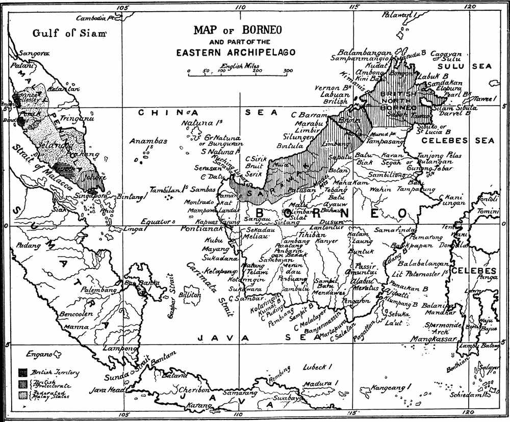 | Map of Borneo and part of the Eastern Archipelago, shewing British Territories, British Protectorates and Federated Malay States, | To face page 96 |