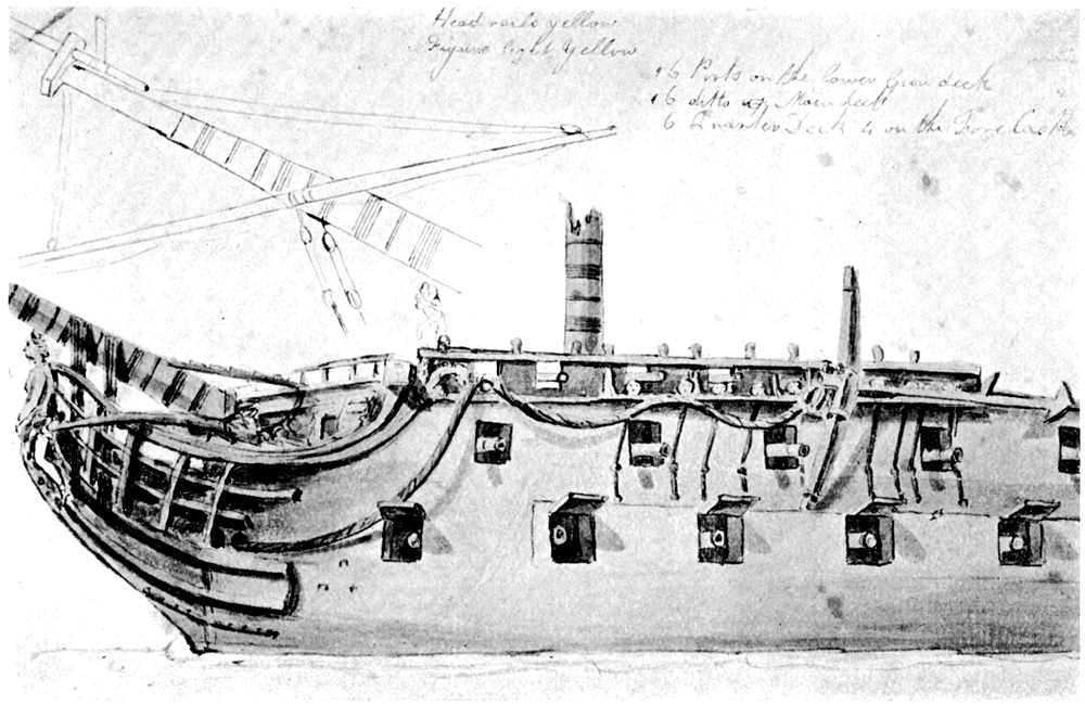 If one had taken a boat and rowed out to such a ship as she lay at anchor, fitted for the sea, towards the end of the eighteenth century, one would have been struck, first of all, by her bulk. The ships had bulging wooden sides, vast stern-works, and cumbrous wooden beakheads. They set one wondering how oak of such thickness could have been wrought to such curves. Till Nelson’s time there was no uniformity in the painting of the exteriors of the ships. The captains used their own discretion, and followed their own tastes, in the selection and application of the colours. The most[Pg 13] general colour-scheme was as follows:—Along the water-line, just above the ruddy gleam of the copper-sheathing, was a wide black streak, running right round the ship, and reaching as high as the level of the lower gun-deck. Above this the sides were yellow, of a yellow sometimes inclining to brown, like the colour of certain varnishes, and sometimes of a brighter tint, like the colour of lemon peel. The after upper-works above the gun-decks, and the outer sides of the poops above the quarter-deck guns, were painted a vivid red or blue. This band of bright colour gradually faded, till by the time of Trafalgar it had become a very deep and dull blue, of a dingy tint that was very nearly black. A band of scarlet or pale blue, edged with gold, ran round the forecastle, and continued down the beak to the figurehead. The outsides of the port-lids were of the same colour as the sides—that is, of a brownish yellow. The stern-works were generally elaborate with gilded carving, gilt cherubs, and the like, and with red, blue, green and gold devices, such as cornucopias, drums and banners, royal arms, wreaths, etc. Round the stern of each ship, outside the glazed cabin windows (we are talking of a third-rate or 74-gun ship), ran a quarter gallery or stern walk, on which the captain could take his pleasure. The supports and rails of this walk were heavy with gold-leaf. First and second-rate ships had three and two stern walks respectively. At the bows, at the extremity of the great beakhead, was the ship’s figurehead, either a ramping red lion[Pg 14] or a plain white bust, or a shield, or some allegorical figure suggested by the name of the ship. The allegorical figure was, perhaps, the most popular among the sailors. They took great pride in keeping it in good repair, with bright gilt on its spear or helmet, red paint upon its cheeks, and pretty blue sashes wherever such appeared necessary.