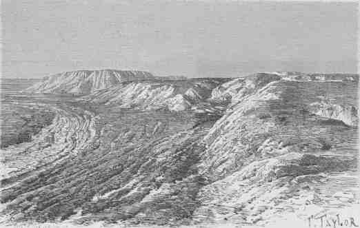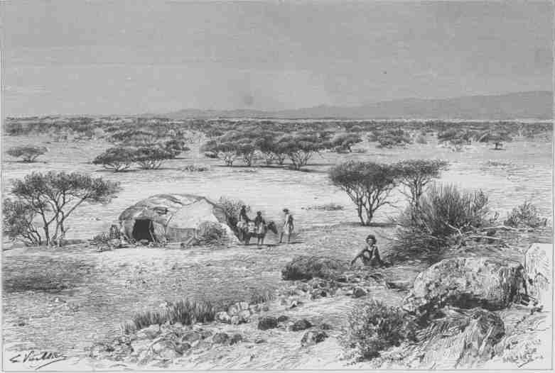Bientôt les timoniers signalent le cap Ras-Bir. A l'horizon courent des montagnes qui s'étendent du nord-est au sud-ouest et s'infléchissent vers le sud entre Obock et Tadjoura. Cette chaîne, prolongement volcanique des côtes de la mer Rouge, s'appuie sur un plateau madréporique que soutiennent des falaises élevées. Le[Pg 6] plateau constitue le territoire d'Obock. Il fut acquis des chefs indigènes en 1862, par le commandant Fleuriot de Langle, et payé dix mille thalaris (cinquante mille francs). Sa superficie est de vingt-cinq lieues carrées.
