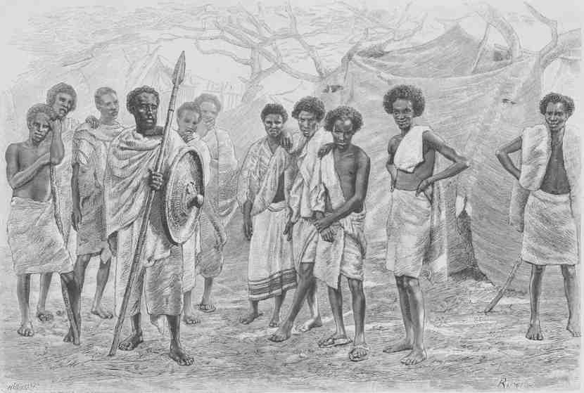 Les Danakils sont noirs de peau, bien constitués, mais grêles de formes. Chasseurs adroits, pêcheurs habiles, coureurs rapides, ils joignent à ces qualités une cruauté et une fourberie dont ils se vantent tout les premiers. Frapper un ennemi par derrière est digne d'éloge; le massacrer, un titre de gloire. La mort d'un adversaire vulgaire donne le droit de porter une année durant la plume noire plantée dans la chevelure; une plume blanche, valable dix ans, est octroyée au vainqueur d'un lion ou d'un Européen. Il est flatteur pour l'Européen d'être traité avec autant de considération que le roi des animaux. La manchette de métal, le bouton d'ivoire au lobe de l'oreille signalent à l'admiration générale les meurtriers les plus éminents.