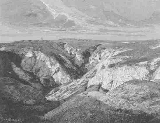 En promenant ma lorgnette sur la côte, je distingue la tour Soleillet, quelques arbres noueux, une dépression verdie par de chétifs palétuviers, le lit d'un torrent desséché, la maison de la Compagnie concessionnaire des dépôts de charbon, un hôpital inachevé et, à quelques milles de là, un amoncellement de houille exposé au grand air.