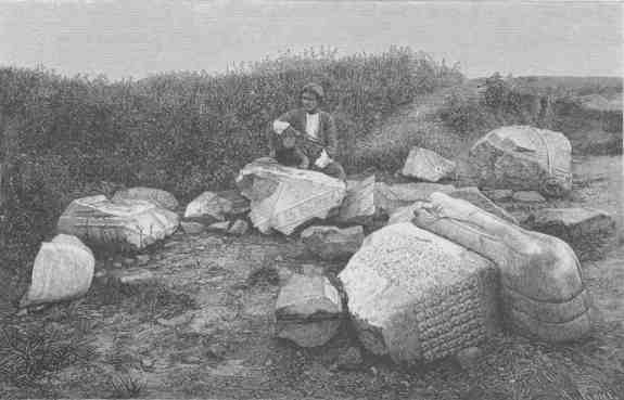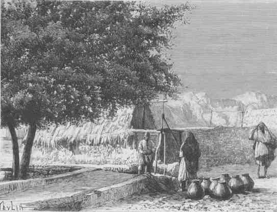Encore un espace rocheux, puis apparaît un grand hôpital, construit avec les matériaux arrachés à la falaise. A droite poussent des buissons, plus bas et plus touffus que les tamaris venus sous l'œil protecteur du gouverneur. La plus haute branche de chacun d'eux est couronnée d'un vieux vase. Cette potiche ainsi placée indique que l'arbre est habité. Sous les rameaux de l'une de ces maisons primitives, j'aperçois deux jeunes filles sommairement vêtues: la plus jeune écrase du blé en promenant sur une pierre dure un cylindre de porphyre aminci à ses extrémités; l'autre regarde travailler son amie.