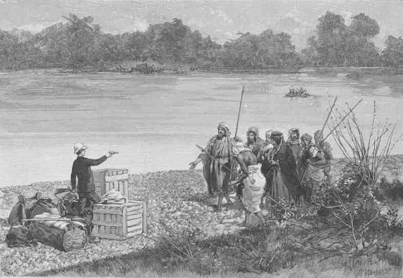 Comme nous les considérons, un Dankali, armé d'une lance, les traits bouleversés, sort d'un épais buisson et se précipite vers nous. La vue de nos revolvers lui inspire de salutaires réflexions, il s'arrête dans l'attitude d'un fauve prêt à bondir. Voilà comment on salue des amis à dix minutes du drapeau tricolore.