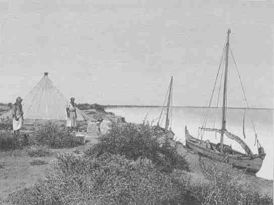 Avec les chalands de charbon et les autorités constituées d'Obock viennent des pêcheurs. L'un d'eux consent à nous transporter aussi près de terre que possible. La plupart des passagers du Tonkin veulent abandonner la cartouche qui, depuis le départ de Toulon, nous sert de domicile. Un bain n'épouvante personne. Enfin on s'organise par séries. Marcel et moi prenons la tête du convoi. Ya Allah! il s'en faut de cinq centimètres que l'eau n'atteigne le niveau des bordages; aussi l'embarcation échoue-t-elle fort loin de la plage. L'ombrelle ouverte, les chaussures sur l'épaule, mes compagnons sautent gaiement à l'eau. Au moment de suivre leur exemple, j'hésite: j'ai dû vivre jadis dans la peau de Raminagrobis. Peut-être même ai-je été parente de Sekhet, la déesse égyptienne à tête de chat, car elle a pitié de ma détresse et me dépêche un noir triton. Grimpons sur les épaules de la providence; c'est le seul moyen d'atteindre la côte à pied sec. Je m'accroche[Pg 9] à la crinière crépue de ma monture, et me voilà partie. Les piétons pataugent, s'enfoncent dans la vase, ramassent des poulpes et des holothuries et se plaignent d'avoir les jambes rôties par l'eau de mer. Ils sont dans leur droit: en quittant le Tonkin, j'ai regardé le thermomètre de la cursive de tribord; il marquait 30 degrés centigrades. Cette température hivernale donne une vague idée du plaisir que doivent ressentir les baigneurs lorsque au mois d'août ils viennent respirer l'air d'Obock-les-Bains.
