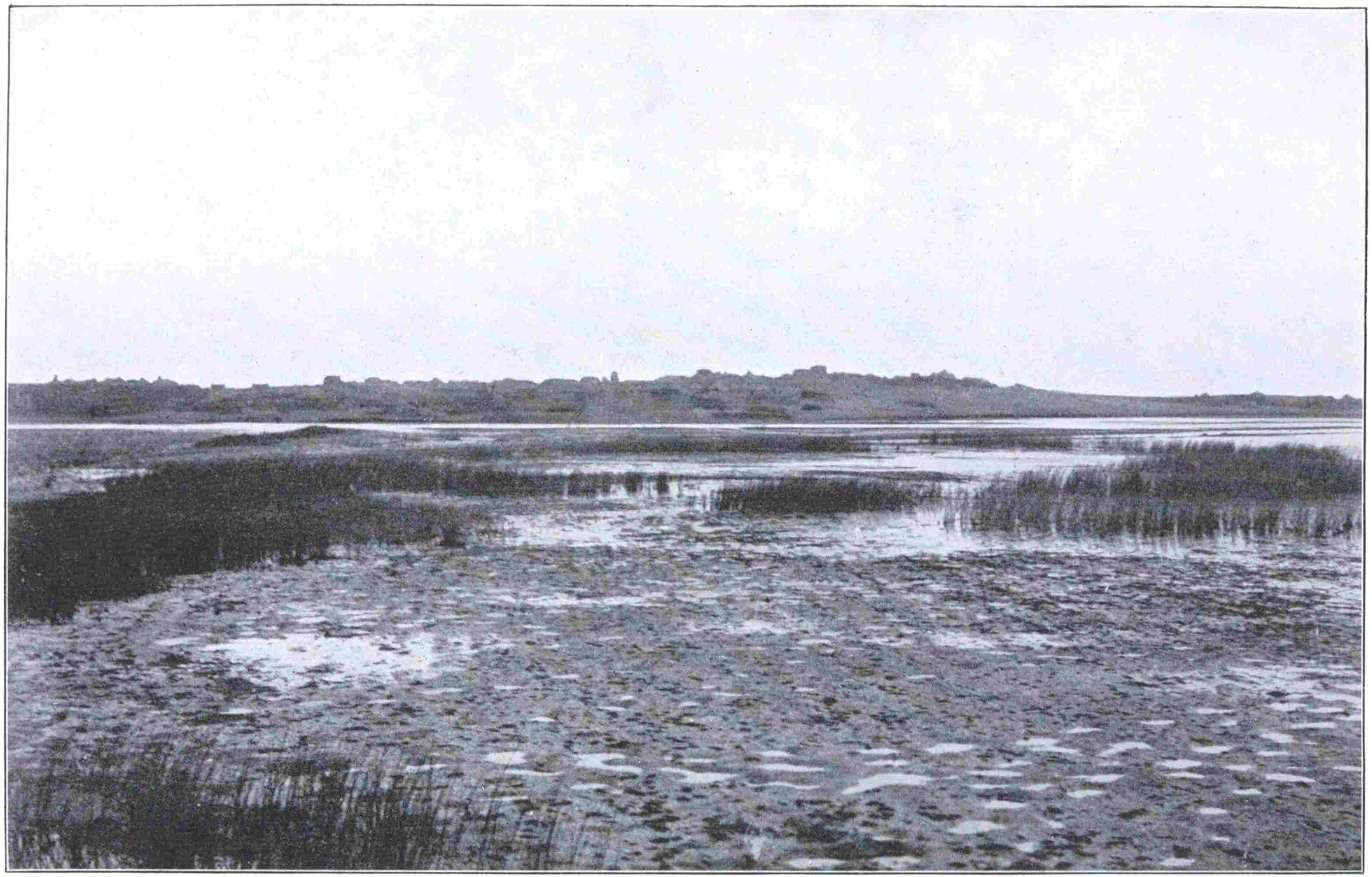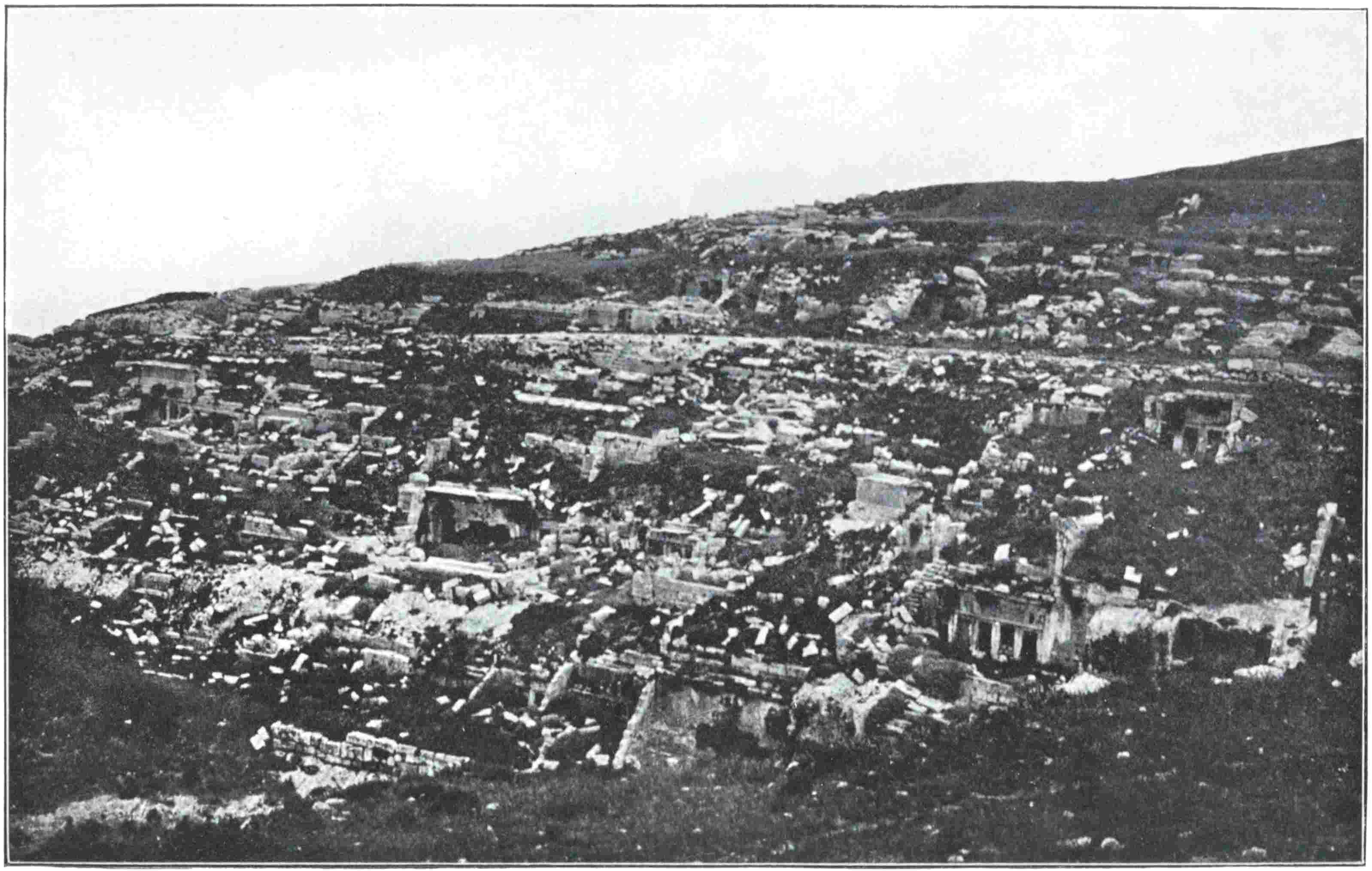 But here, as elsewhere, we scanned the few bare spaces in vain for potsherds of early style. Thick layers of late ruin and silt lie over them, and the three-foot corn-stalks stand above all. Only one noteworthy marble appeared on the surface, a pedestal with four reliefs, described by James Hamilton and other travellers. It is of fair workmanship, and inscribed with a greatly perished dedication not earlier than the age of the later Ptolemies. In the hollow between the two halves of the city, and over a wide area outside the walls, both south and north, innumerable dressed blocks stand upright, one behind another. With a field-glass one may see these puzzling files radiating from the city far out over the lower plain, ranged seemingly at random, as a baby might set toy bricks on end. I guessed at first they might be unwritten head-stones133 of poor graves; but, seeing they occurred within the walls, and mostly in the lower lying places—for instance, about the upper part of the central hollow, below the vaulted reservoirs—I came to suspect they had once carried wooden pipes, which distributed the Apollo waters over the lower plain and the contents of the reservoirs to a part of the upper city; and I still can find no better reading of their riddle.