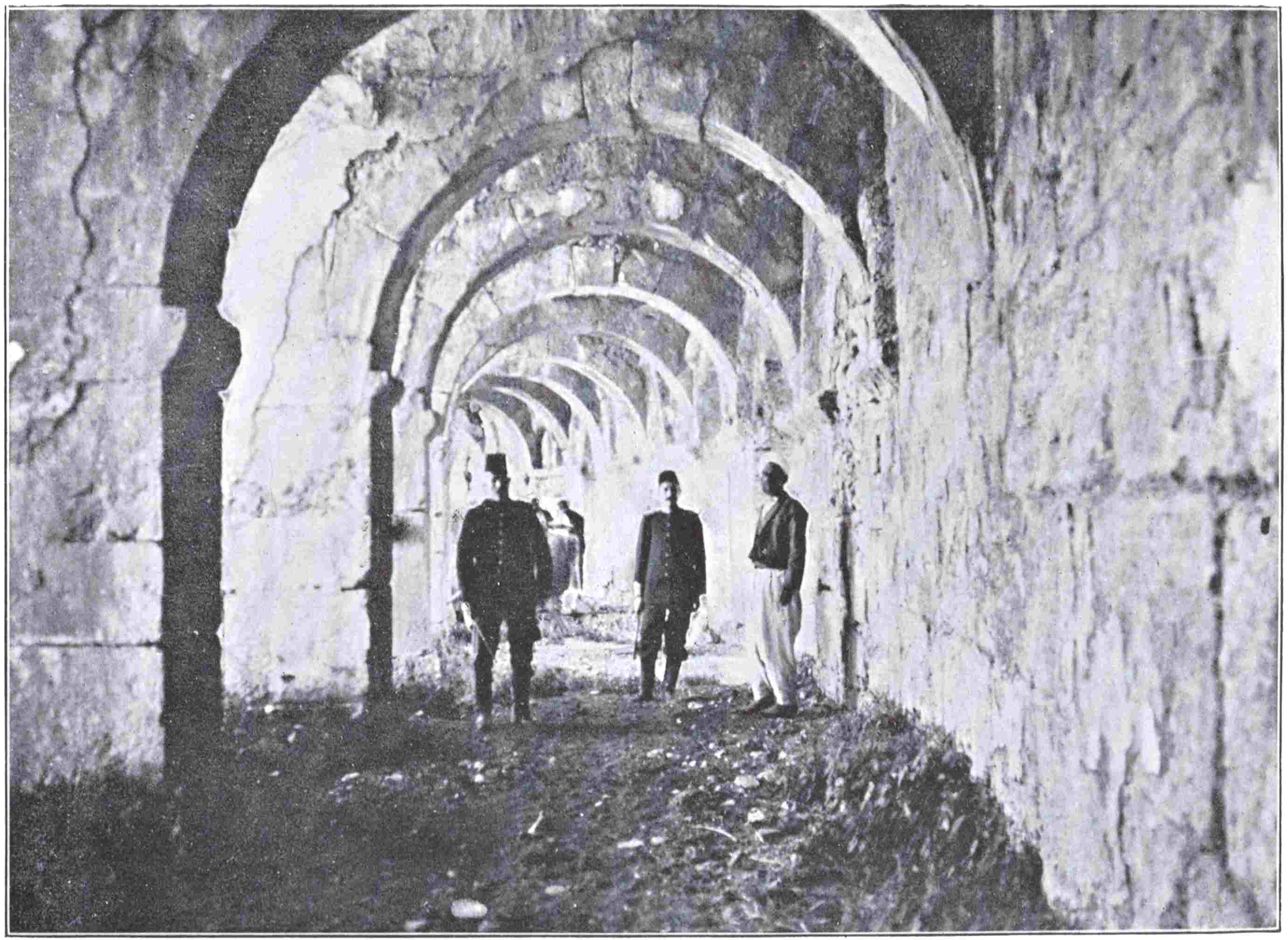 Among the myriad mansions of the dead we heard the first sounds of men. Voices cried to us from tombs opening high on a hillside below a thin crown of pines; but the two or three troglodytes, who came out128 to view, went back at sight of our soldiers. Unmet and unsaluted, we followed the splendid curves and counter-curves of the road, till at last it ran out on a level stretch; and there near a single hut of rough stones, under the bloody flag of Turkey, we came on the booted mudir himself in council with four spearmen of the Haasa. He looked up in some astonishment and trouble, for few and far between are European visitors to Cyrene. But the breeding of a Turk, the custom of Islam, and the sight of our Iradé, secured us hospitality in his bullet-proof room, built above a Roman sepulchre.