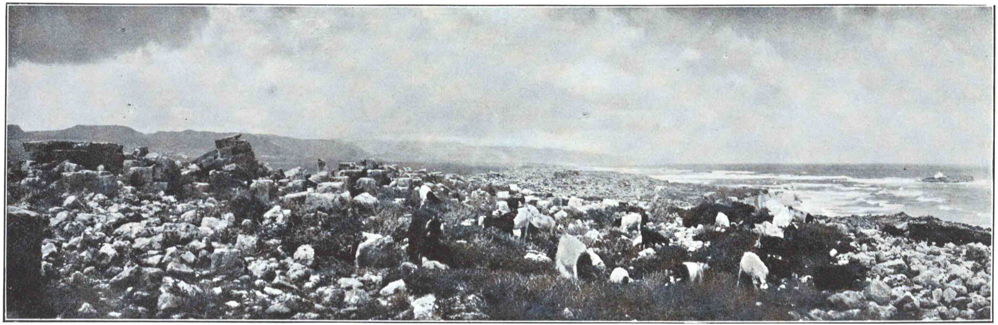 More, however, they did desire. We were Western men, with an itch to be doing, and we tried to fulfil our souls a little among the fallen churches and rock-tombs of Apollonia. But, with all our leisure, we made no great discovery there; and I doubt if the best thing we found were not wild watercress growing thickly in the138 conduit, which we taught the Cretans and the soldiers to relish. What is left of Apollonia is only a long landward slice of the city, which in Christian times outstripped dying Cyrene. All the seaward face of it, with the harbour-wall and gate and port, has been eaten by the waves. There is no doubt the coast has sunk here since Roman times, and is probably sinking still, and that the shallow bay, all rocks and shoals, in which we had made a difficult landing, is not any part of the old harbour of Apollonia, but was dry land when that harbour was sought by shipping. The reefs and islets, out at sea, over which the surf was now breaking so wildly, remain perhaps from the old foreshore. Further westward we found tombs into whose doors the waves flowed freely, and, had it been fairer weather, we might have espied others altogether submerged; for the calm sea on this coast is of such a wonderful clearness that when our leadsman was dipping for an anchorage on the first evening off Ras el-Tin, he could see a bottom of rock and sand, which, nevertheless, his plummet could not reach.