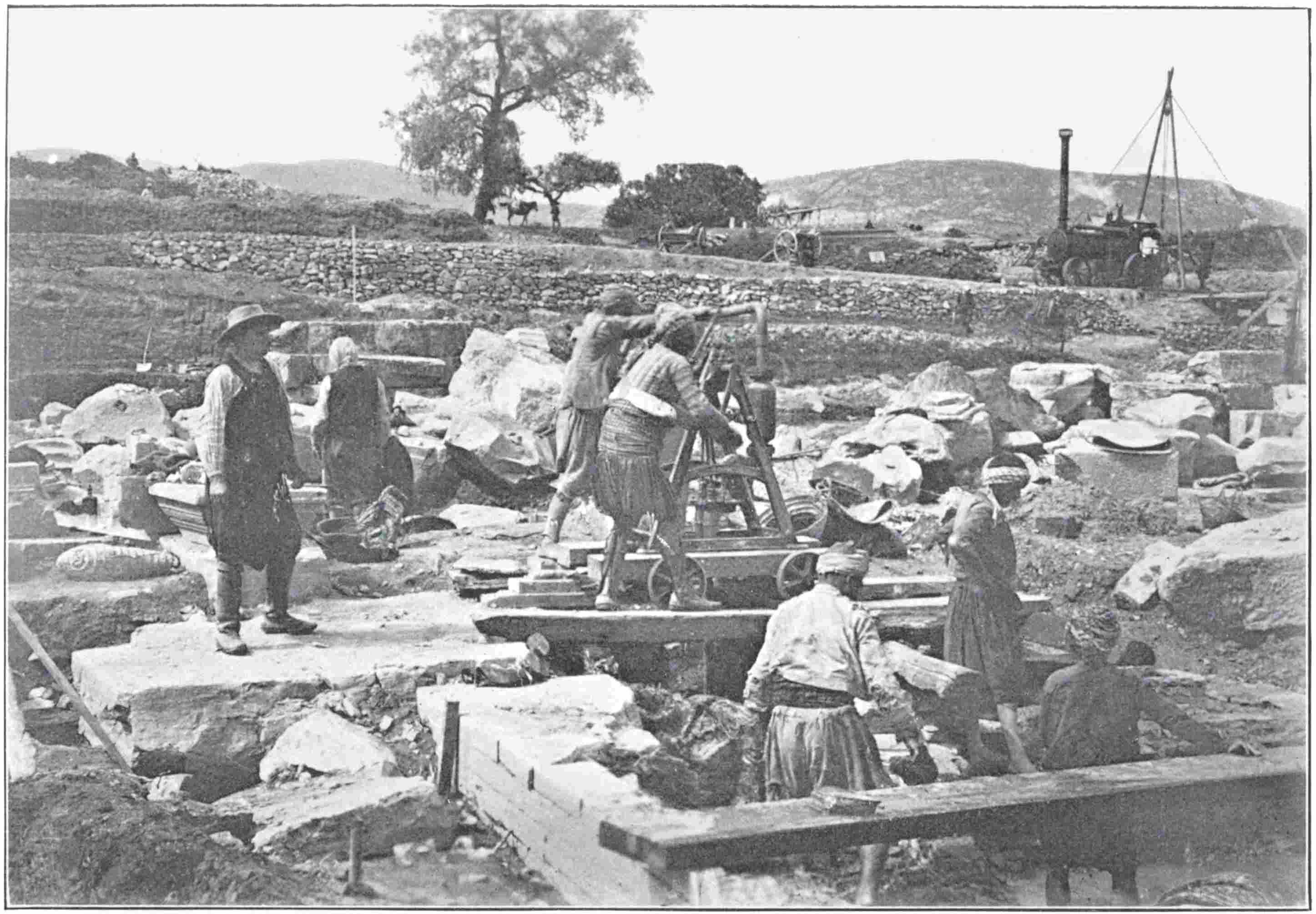 October passed away thus, and November was on the wane; but no prize had appeared to lighten our weary days. Already we had pierced the platform at several points to meet with nothing better below it than sand and water. What, in reason, was to be hoped above it, where diggers from Justinian’s day to Wood’s had rummaged and robbed? We cajoled despair with the most insignificant discoveries—with patches of bare pavement, with scraps of Roman inscriptions chipped out of masses of Byzantine concrete, with a few sherds of Greek vases and broken terra-cottas sifted out of the bedding of the temple-steps built in Alexander’s day. In a world where the absolute is never attained, the relative, thank heaven! can always please, and Nature, of her pity, with a little of your contributory good will, will blind you to relativity.