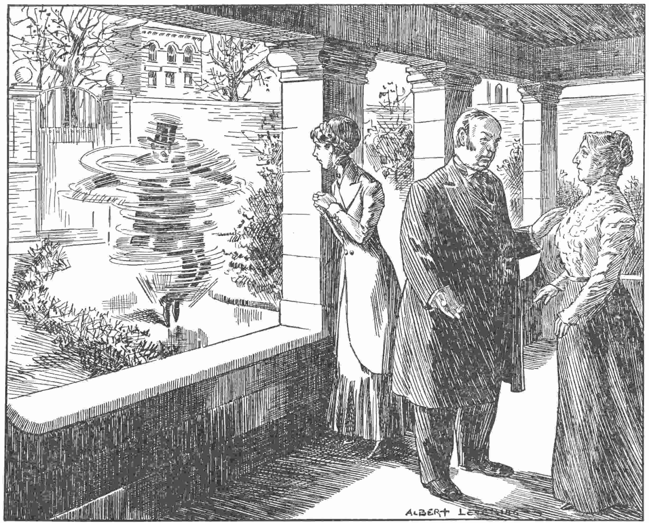 But while I was standing in dismay love found a way, as love always will, and Anne rushed to the cellar and brought out the stepladder and the ice pick. Placing the stepladder close to Walsingham she climbed it, and holding the point of the ice pick at the exact center of the top of the hat she pushed down. In a moment a sizzing noise told us that she had bored a hole in the31 hat, letting the vacuum escape, and the hat flew from Walsingham’s head.