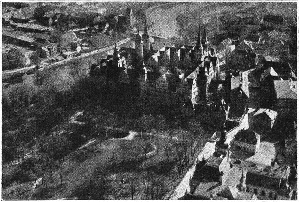Bild 1 zeigt uns das alte Bischofsschloß von Merseburg mit seinen Türmen, Giebeln und Höfen. Wir sehen, wie der Wehrgedanke es war, der den Bau dieses Schlosses beeinflußt hat. Hochgelegen am Ufer der Saale beherrscht es die Saalebrücke, man konnte also vom Schloß aus den Verkehr über die Brücke kontrollieren und gegebenenfalls verhindern. Die Erfindung des Schießpulvers machte diesen Bau militärisch wertlos, gegen Kanonenkugeln gaben auch diese imposanten Mauern keine Sicherheit mehr. Die Bedeutung dieses Schlosses schwand dahin – heute sind die Regierungsbehörden des Regierungsbezirkes Merseburg in diesem Schloß untergebracht.