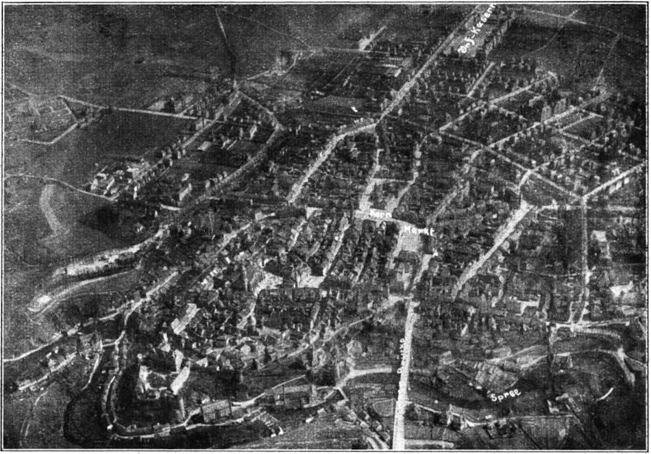Der Unterschied zwischen alter und neuer Bauerei ist auch auf diesem Bild deutlich zu erkennen: Die alte Stadt paßt sich natürlich dem Lauf der Spree an, ihre Form wird unter geschickter Ausnutzung des Geländes zwar uneinheitlich, aber ansprechend – im Gegensatz zur neuen Stadt, die (rechts oben im Bild deutlich erkennbar) genau so lieblos mit dem Lineal konstruiert ist, wie wir es bei Zwickau gesehen haben.