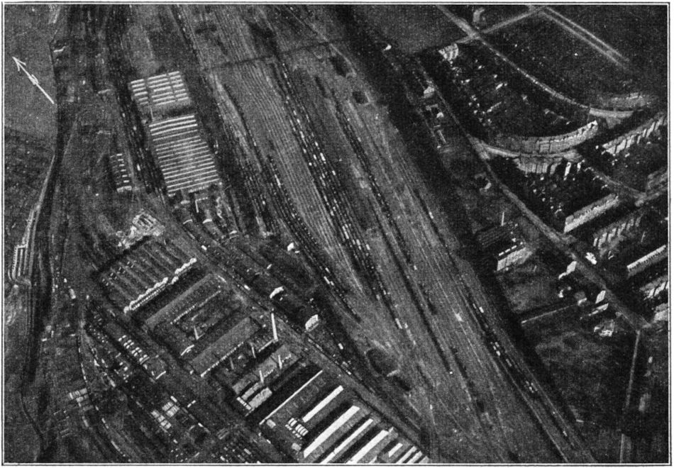 Und schließlich noch ein modernes Bild: der Kohlenbahnhof und die Eisenbahnwerkstätten von Chemnitz. Diese Anlage stellt einen Höhepunkt unsrer technischen Entwicklung dar – allerdings ist der Rückgang, der sich auf allen Gebieten nach dem verlorenen Krieg und dem Friedensvertrag von Versailles zeigt, auch hier zu spüren: in frühren Zeiten war auf diesem Bahnhof wesentlich mehr rollendes Material abgestellt als heute. Das Ganze macht einen wohldurchdachten Eindruck, vom Standpunkt des Technikers kann man die ganze Anlage schön und formvollendet nennen. Wir merken in unserm Flugzeug nichts von Staub und Rauch, der unten auf der Erde die Menschen belästigt, wir urteilen also frei und unbefangen und schließen uns der Ansicht des Technikers an. Die Bahnhöfe unsrer Heimat haben auch ihre guten Seiten, wenn es auch nicht immer gleich auf den ersten Blick zu spüren ist!