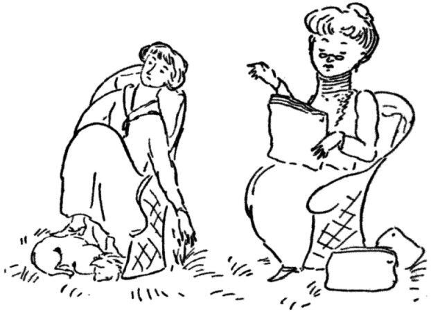 “Will you write a description of my home?” I suggested. “Tell them that it is a solid enough house, stucco in front and bricks at the back; a cat-run and some laurel bushes facing the road, and a gardener and another cat-run behind the house. In the middle of the back cat-run there is a tennis net and three seedy deck-chairs, one of which supports a blonde authoress with ill-defined features, the other an aunt with a high forehead and ideals about literature; the third will shortly contain a husband who will come home in about half an hour with[Pg 5] a pink evening paper. What is there in all that to cheer a reader who is in the same unfortunate position herself?”