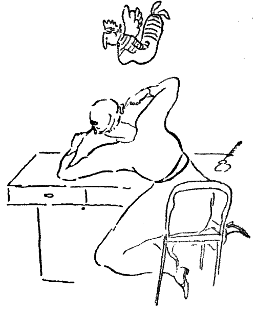 “What shall I order for breakfast instead of the fish?” demands cook, lightly poised for flight beside the writing-table.