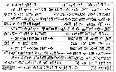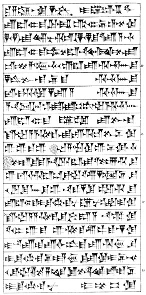 These words suggest that Ashur-bani-pal could not only read cuneiform texts, but could write like a skilled scribe, and that he also understood all the details connected with the page 17craft of making and baking tablets. Having determined to form a Library in his palace he set to work in a systematic manner to collect literary works. He sent scribes to ancient seats of learning, e.g., Ashur, Babylon, Cuthah, Nippur, Akkad, Erech, to make copies of the ancient works that were preserved there, and when the copies came to Nineveh he either made transcripts of them himself, or caused his scribes to do so for the Palace Library. In any case he collated the texts himself and revised them before placing them in his Library. The appearance of the tablets from his Library suggests that he established a factory in which the clay was cleaned and kneaded and made into homogeneous, well-shaped tablets, and a kiln in which they were baked, after they had been inscribed. The uniformity of the script upon them is very remarkable, and texts with mistakes in them are rarely found. How the tablets were arranged in the Library is not known, but certainly groups were catalogued, and some tablets were labelled.2 Groups of tablets were arranged in numbered series, with "catch lines," the first tablet of the series giving the first line of the second tablet, the second tablet giving the first line of the third tablet, and so on.