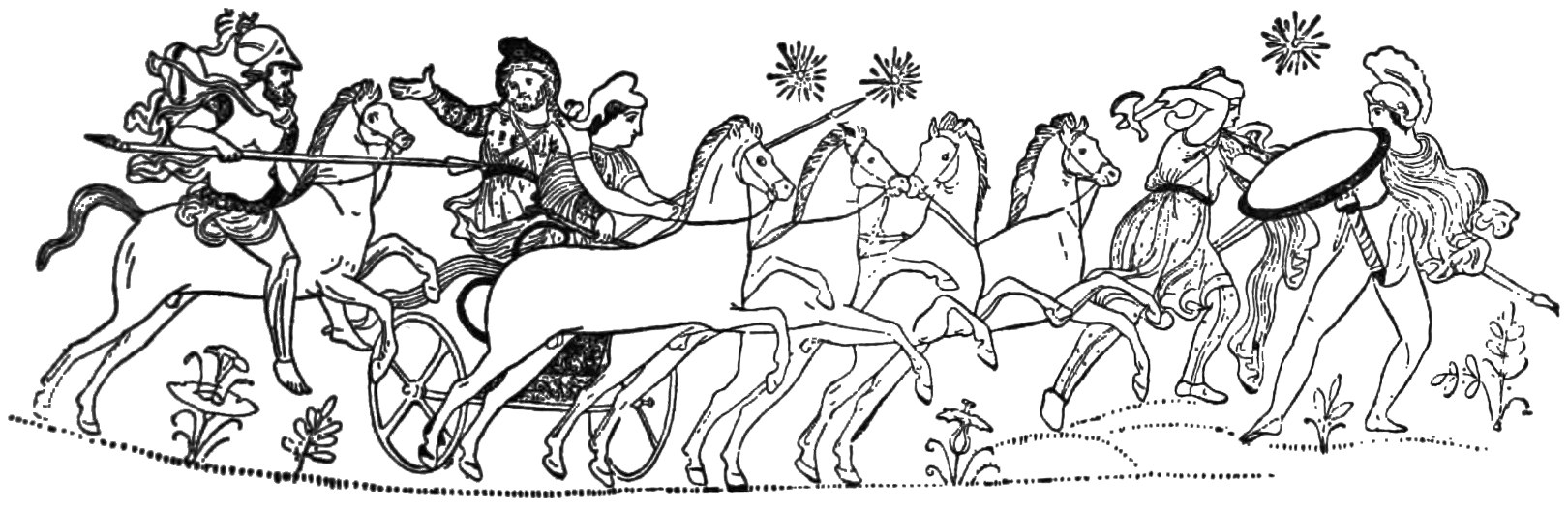 Xenophon ordered some of the least exhausted of his hoplites to charge, and drive them back; and the sick men at the spring helped by shouting with all their might, and striking their spears against their shields. The enemy were soon routed, and fled as fast as they could, but were hindered by the snow. Xenophon then marched on, but before leaving the sick men, he165 promised that as soon as possible, he would send some of their comrades to fetch them.