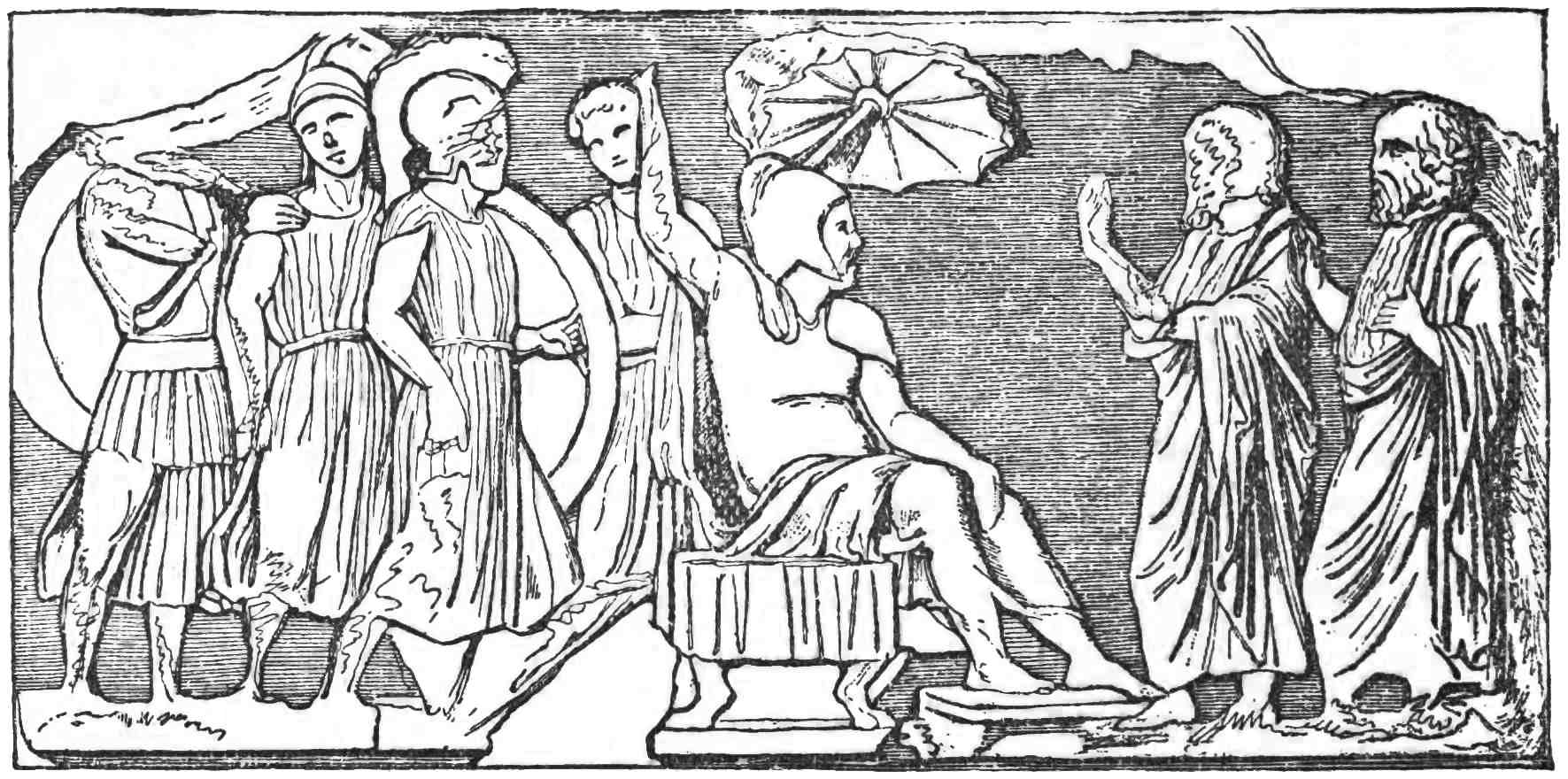In his old age Xenophon had the grief of losing one of his dearly loved sons, who fell in battle. The news was brought to him as he was standing, crowned with a garland, before the image of the goddess, about to offer a sacrifice. On hearing it he put off the garland, the emblem of joy and gladness; but when he was told his son had fallen in fair fight, after a brave resistance, he put on the garland again, and ended the sacrifice, saying, ‘I knew that my child was mortal.’