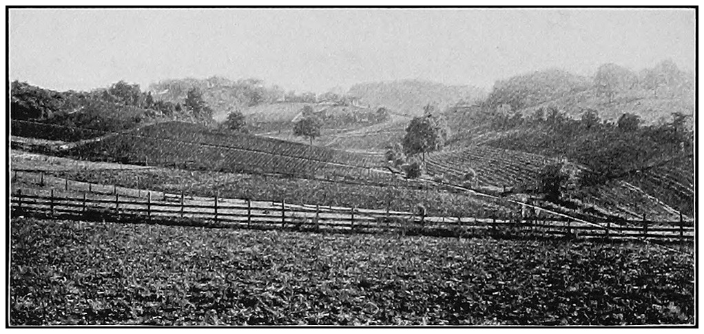 Around Knoxville are fine farms also, just as we find them about Harrisburg, Hagerstown, Winchester, and almost everywhere else in the Great Valley. Our view (Fig. 52) is taken near Knoxville and shows sloping fields always ready to bear good crops. The soils have been made by the wasting of the top parts of these same beds of marble and of other rocks found along with it.