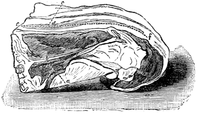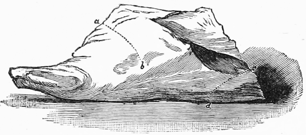 This is excellent, possessing the fine flavour of a really well cured ham, and retaining it unimpaired for a very long time after it is cut or cooked, if kept in a cool larder; it is therefore a valuable and inexpensive store for imparting savour to soups, gravies, and other preparations; and it affords also a dish of high relish for the table. An inch or two of the lean part, quite cleared from the smoked edges and divided into dice, will flavour well a tureen of gravy, or a pint of soup: even that which has been boiled will greatly improve the flavour of Liebig’s extract of beef, and of any simple broth or consommé. From the depth of fat upon it, which appears particularly rich and mellow, we think it is the thick flank of the beef of which we have made trial in various ways, and which is now in much request in several families of our acquaintance, who find it greatly superior to the common hung or Dutch beef, to which they were previously accustomed.
