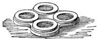 As soon as the milk boils, mix gently A and B together, and with a small spoon take portions of this shape and size and lay them over the surface of the boiling milk till it is entirely covered with them. Let them boil for four or five minutes to cook them; then put them in convenient order on the ground of the greased casserole (stewpan). Go on putting in the same manner small portions of the mixture on the surface of the boiling milk, and when cooked, place a new layer of them in the stewpan over the first; and continue the same operation until the mixture is all consumed. Take now the remainder of the milk, and add it to the beaten yellow (yolks) of two eggs, some sugar, and some powdered vanilla. Pour this over the cooked pastry in the stewpan, and set it into a gently heated oven. Leave it there until it gets brown; then powder it with vanilla-sugar, and send it to the table.